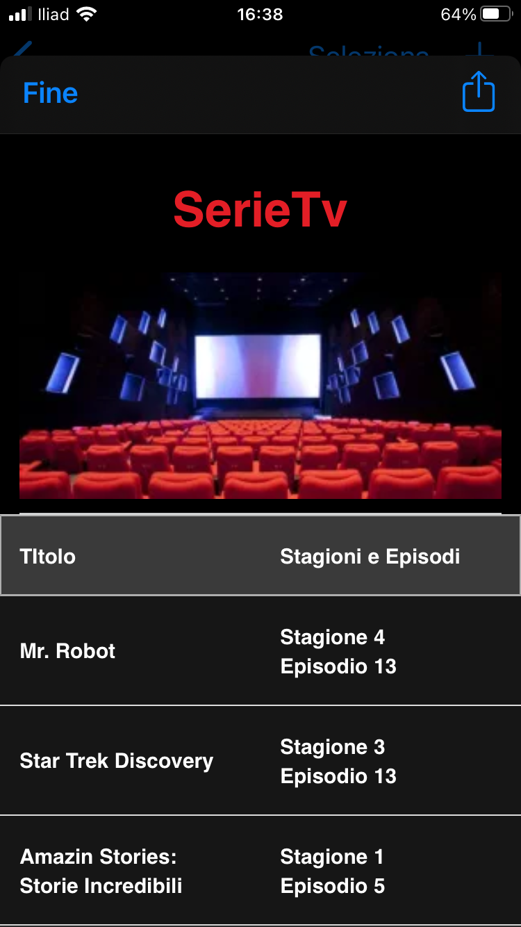 con questa opzione potrete visionare la lista impaginata di tutte le vostre serie tv preferite con relative stagioni e episodi, che avete inserito con questo comando.